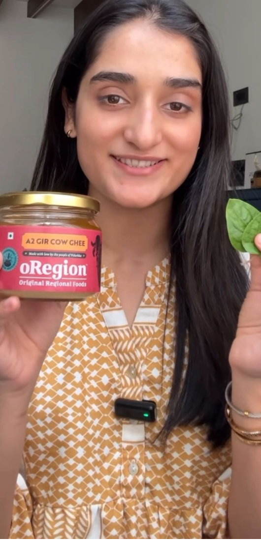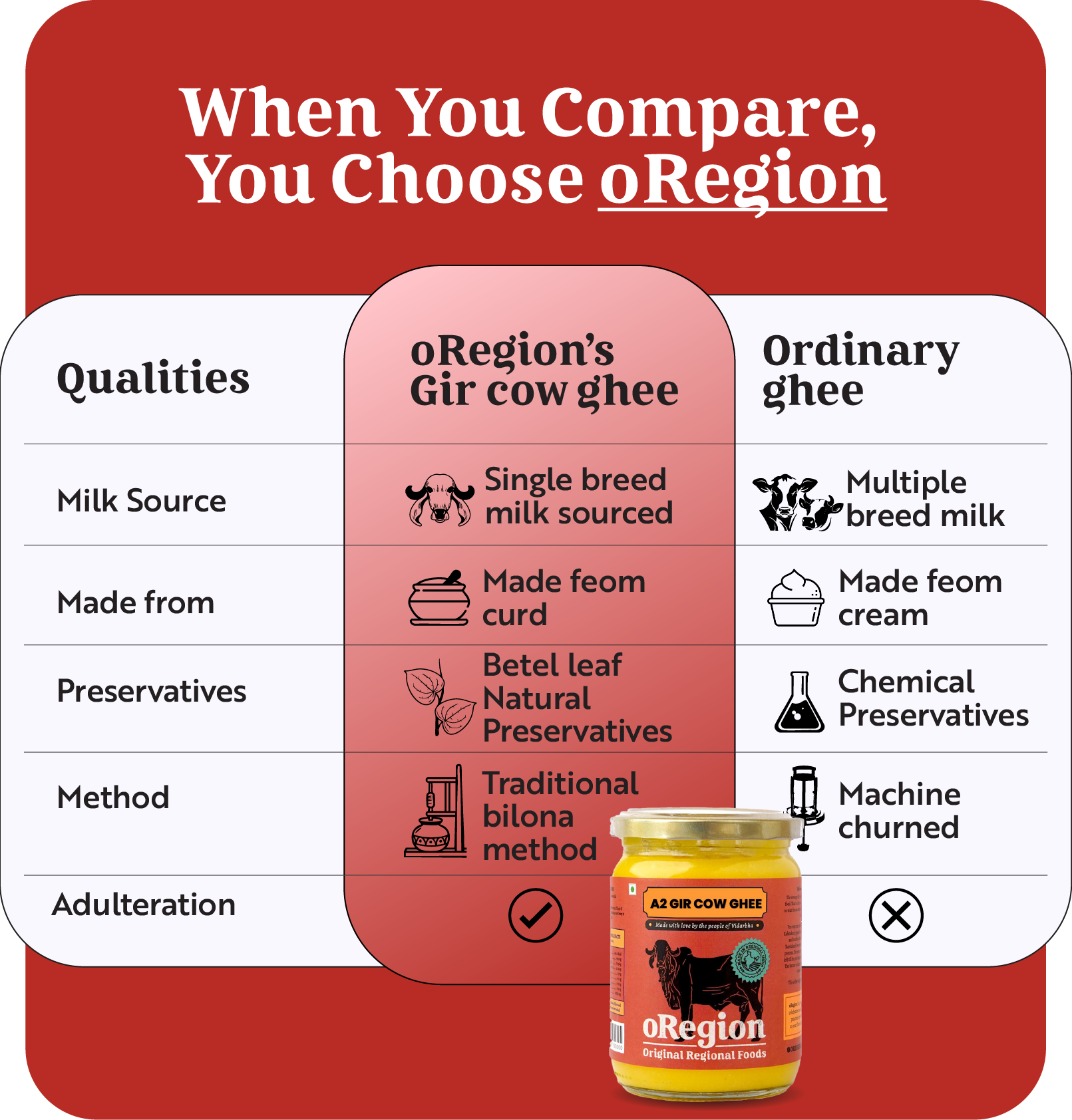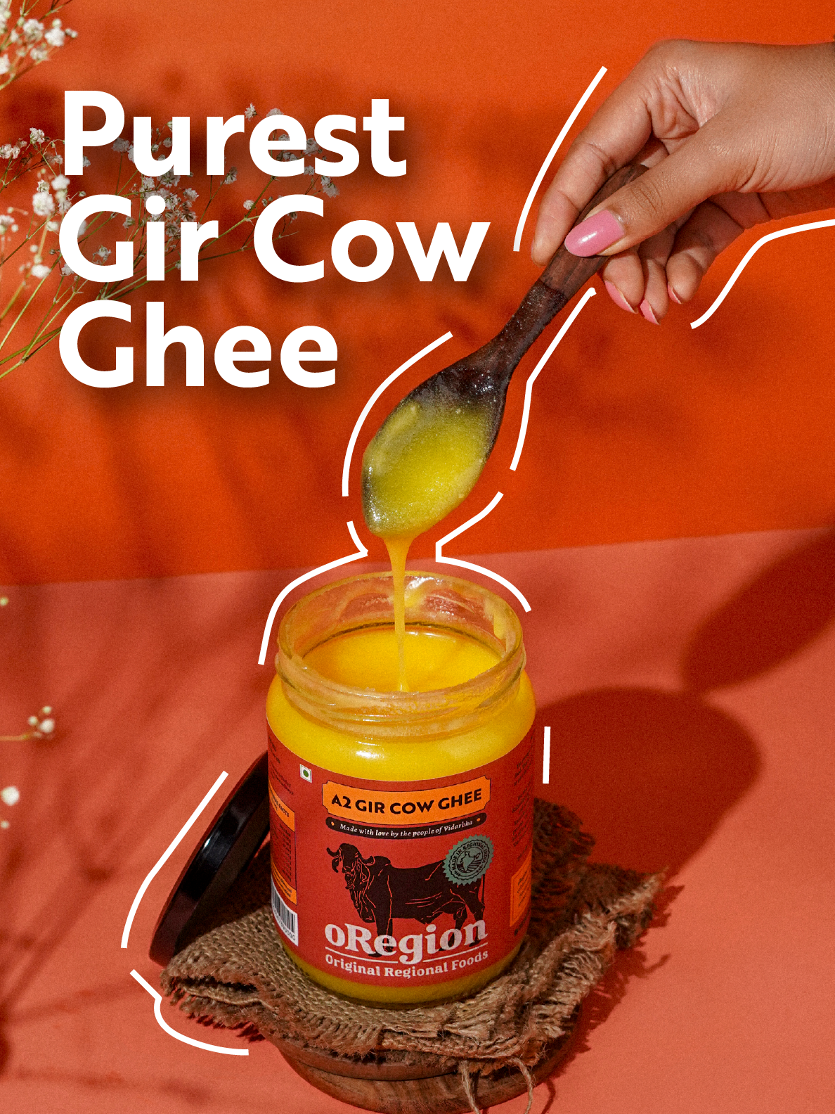 Indulge in the pure and rich taste of oRegion A2 Gir Cow Ghee, hand-crafted with traditional Bilona churning and containing natural Betel Leaf preservative for a flavourful and healthy experience.