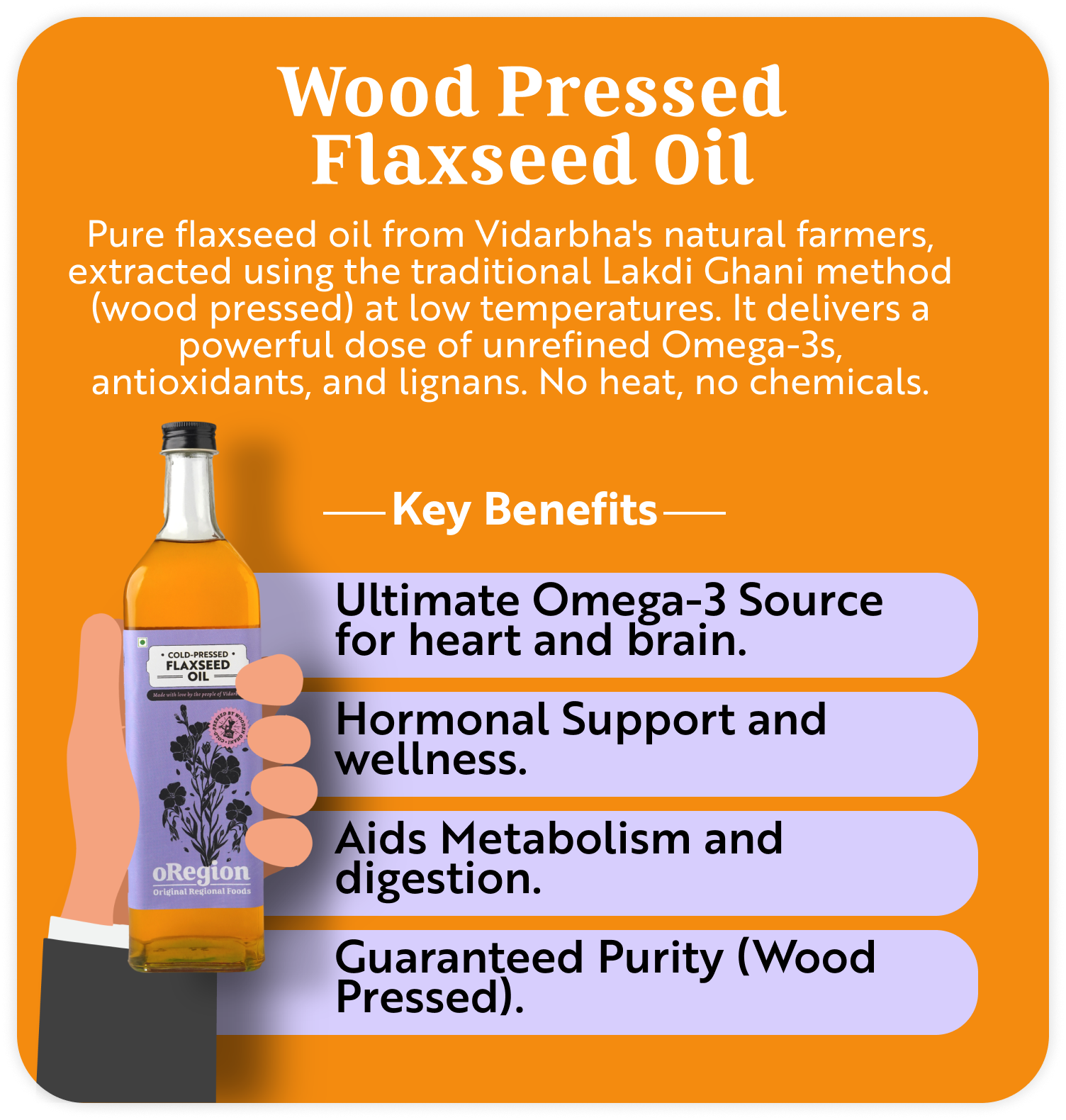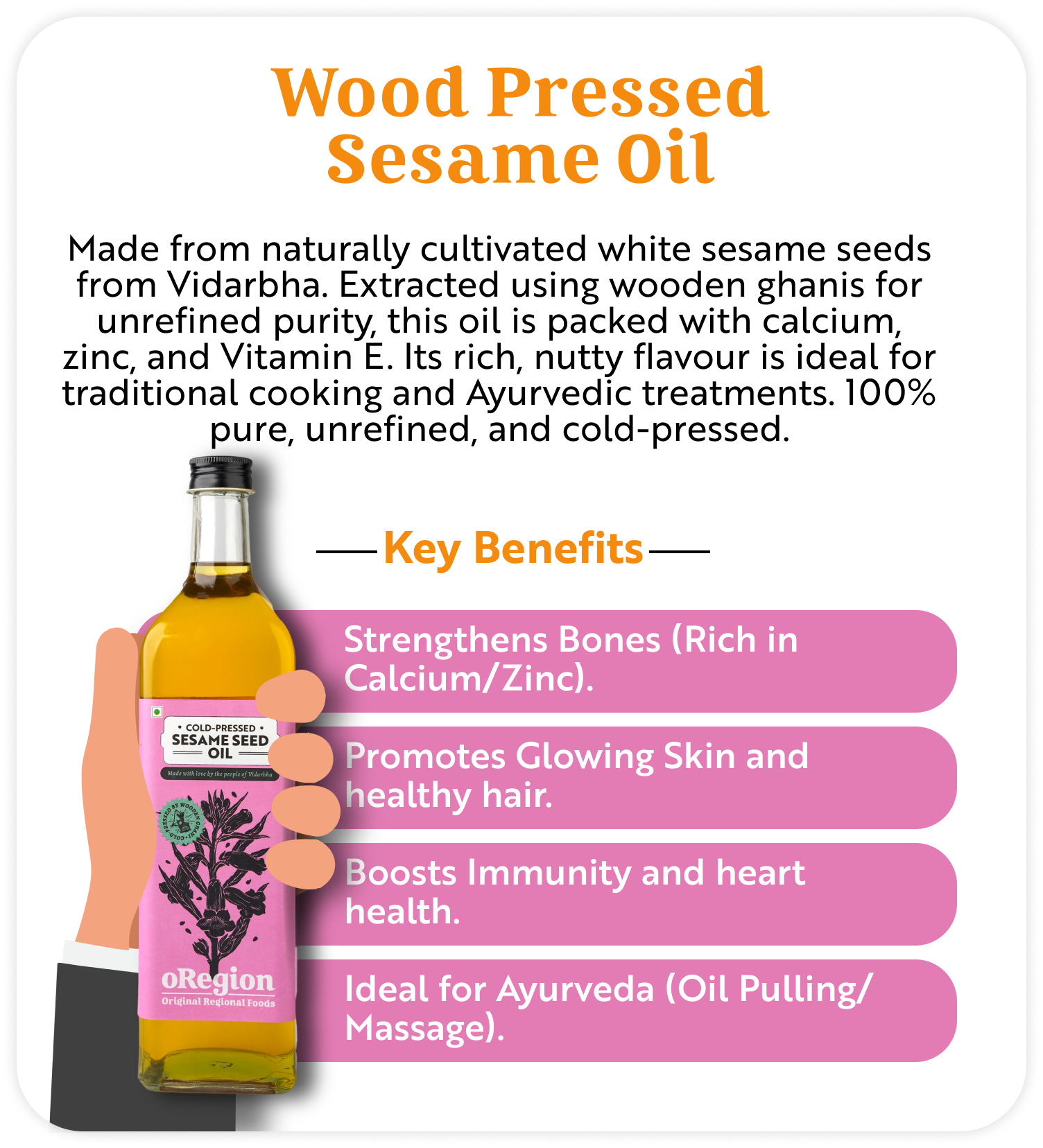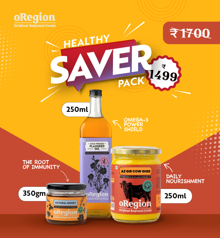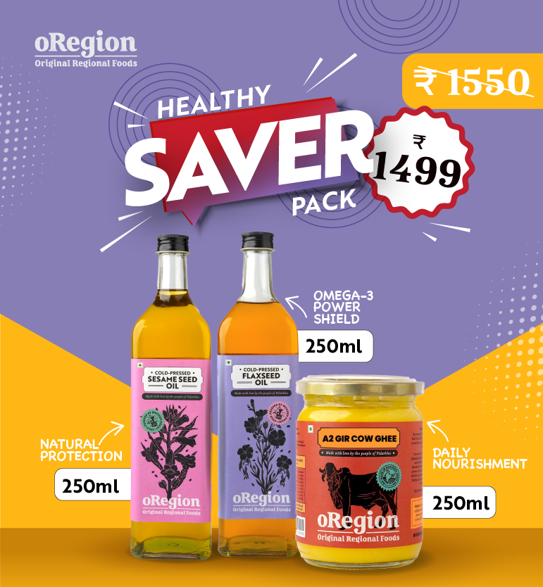 Crafted with pure, regional ingredients and approved by leading celebrity nutritionists, the oRegion Healthy Saver Pack brings Sesame Oil, Flaxseed Oil, Ghee & Honey together from just ₹999. Trusted by 10,000+ families for its quality, purity, and consistency.